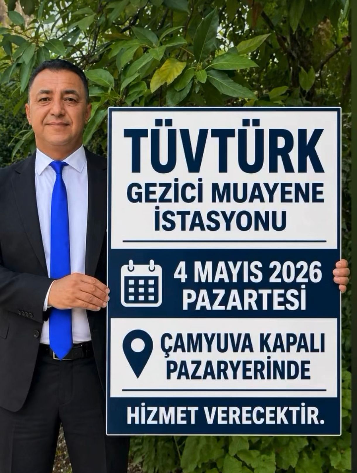 Muhtar Günay’ın yaptığı bilgilendirmeye göre, TÜVTÜRK Gezici Muayene İstasyonu 4 Mayıs 2026 Pazartesi günü Çamyuva Kapalı Pazaryeri’nde kurulacak. İstasyon, araç muayenesi yaptırmak isteyen vatandaşlara gün boyunca hizmet sunacak.