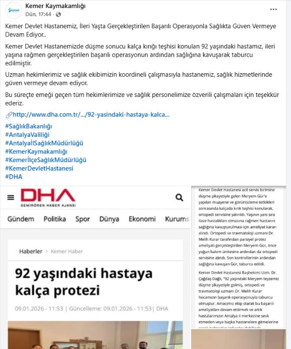 Hastanenin ortopedi ve anestezi birimlerinin koordineli yürüttüğü süreçte, hastanın genel durumu ve yaşına bağlı riskler en ince ayrıntısına kadar değerlendirildi. Ameliyat sonrası rehabilitasyon sürecini de hızla atlatan 92 yaşındaki hastanın taburcu edilmesi, hem ailesi hem de hastane personeli tarafından büyük bir sevinçle karşılandı. Bu operasyon, Kemer Devlet Hastanesi’nin teknik donanımı ve hekim kadrosunun, en zorlu vakalarda bile yüksek standartlarda hizmet verebildiğini bir kez daha kanıtladı.