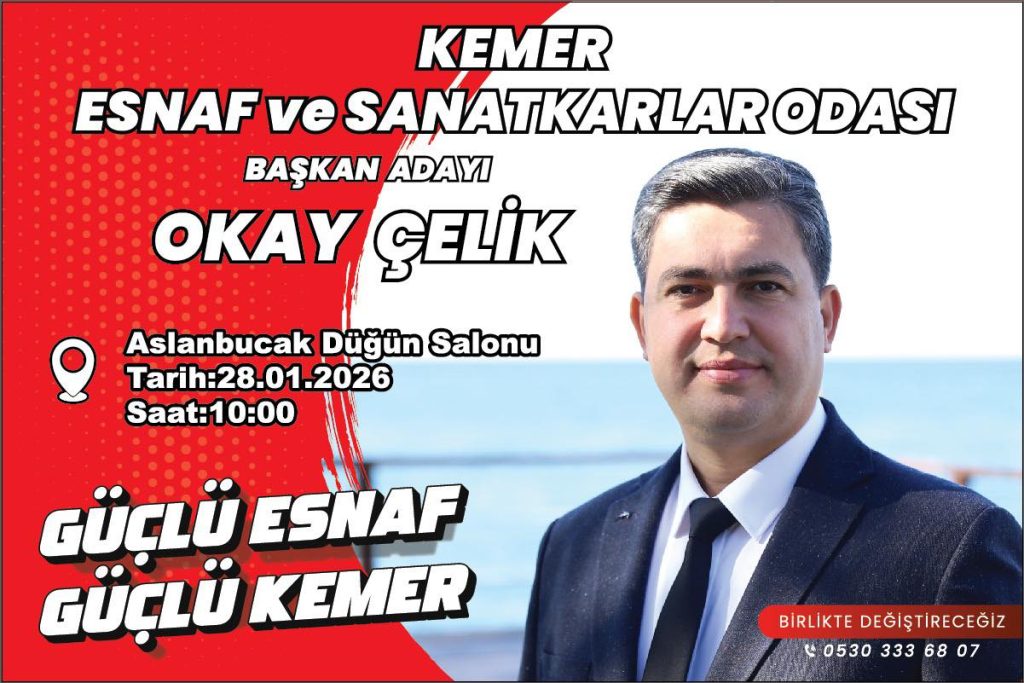 Kemer Esnaf ve Sanatkârlar Odası’nın 28 Ocak’ta yapılacak olan 13. Olağan Genel Kurulu öncesinde heyecan dorukta. İlçenin sevilen esnaflarından başkan adayı Okay Çelik, “Değişim” sloganıyla yürüttüğü seçim çalışmalarında esnaftan tam not alarak yarışın en güçlü ismi olarak öne çıkıyor.